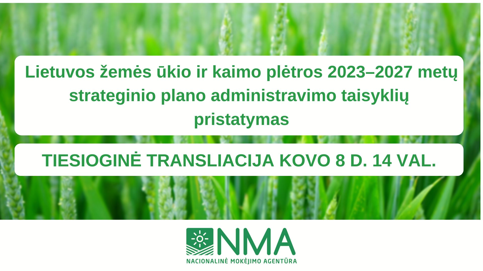 Šį trečiadienį, kovo 8 d., bus vykdoma tiesioginė transliacija, kurioje bus pristatomos Lietuvos žemės ūkio ir kaimo plėtros 2023–2027 metų strateginio plano (Strateginis planas) administravimo taisyklės.