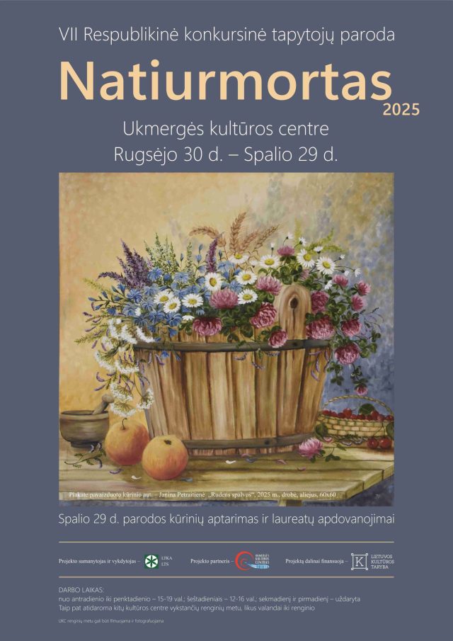 Pradinis VII Respublikinė konkursinė tautodailininkų tapybos paroda „Natiurmortas” VII Respublikinė konkursinė tautodailininkų tapybos paroda „Natiurmortas” By vilkmerge.lt - 2025-10-05 0 FacebookTwitterPinterestWhatsAppEmailSpausdintiTelegramCopy URL Kalendorius Kada: 2025-09-30, 09:00 – 2025-10-29, 13:00 2025-09-30T09:00:00+03:00 2025-10-29T13:00:00+02:00 Kur: Ukmergės kultūros centras Parodos VII Respublikinė konkursinė tautodailininkų tapybos paroda „Natiurmortas”