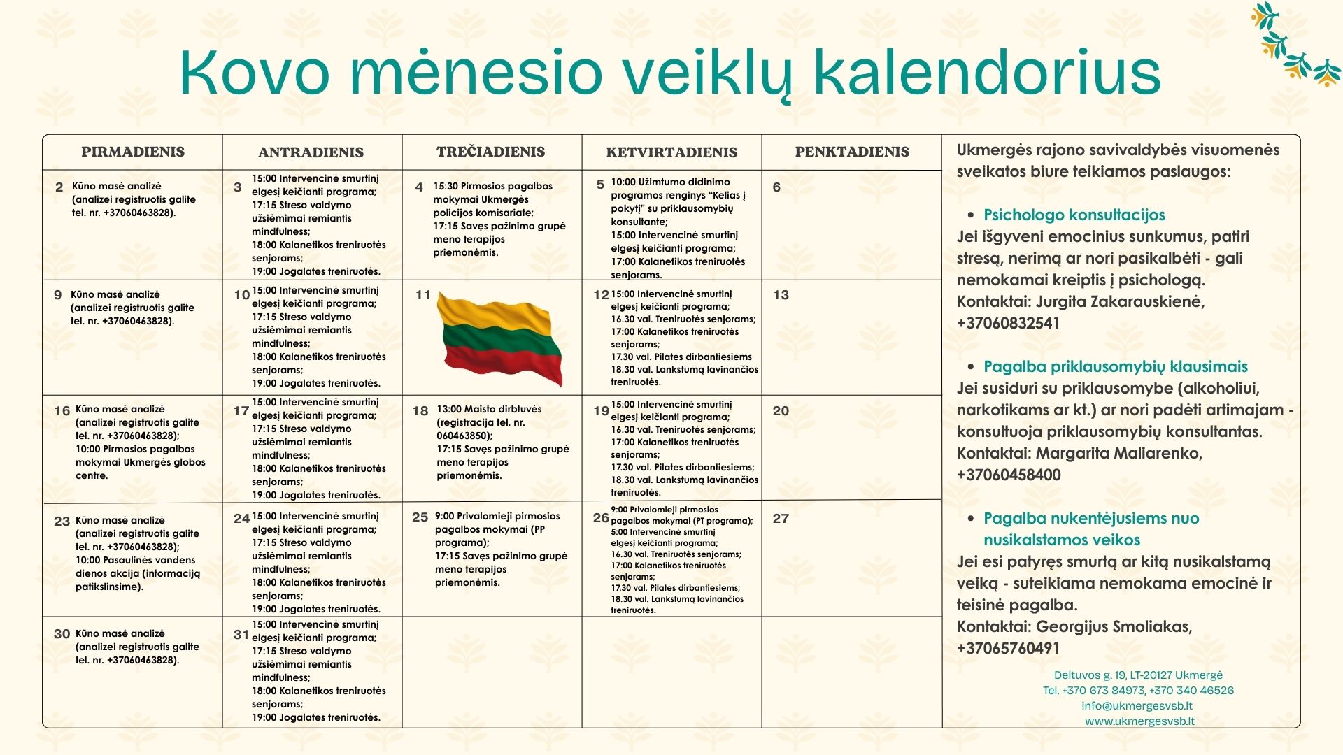 Pradinis Kultūra Anonsai visi Kviečiame dalyvauti Ukmergės visuomenės sveikatos biuro organizuojamose veiklose visą kovo mėnesį KultūraAnonsai visi Kviečiame dalyvauti Ukmergės visuomenės sveikatos biuro organizuojamose veiklose visą kovo mėnesį By PS - 2026-02-26 FacebookTwitterPinterestWhatsAppEmailSpausdintiTelegramViberCopy URL Kovo mėnesio veiklų kalendorius.