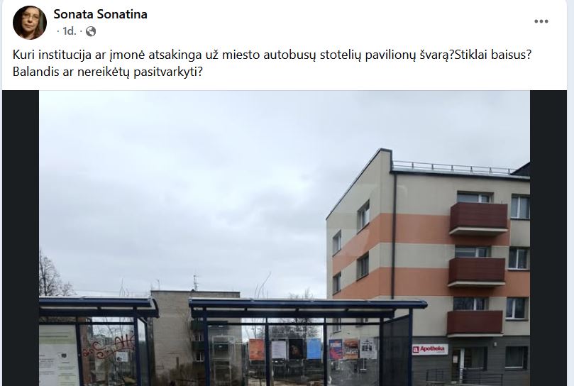 Viešojoje erdvėje pasirodė ukmergiškės komentaras apie autobusų stotelių paviljonų švarą. Keliamas klausimas, kas atsakingas už jų priežiūrą ir ar nereikėtų imtis tvarkymo darbų.