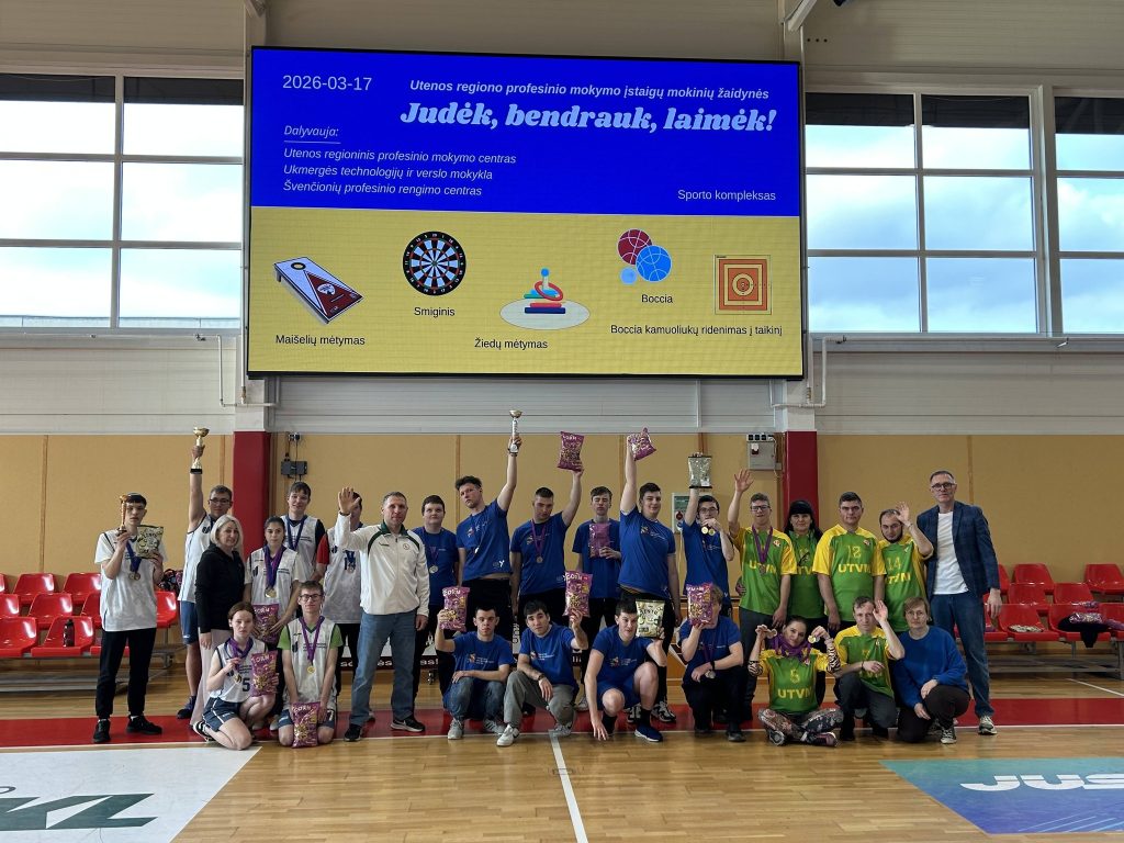 Kovo 17 dieną Ukmergės technologijų ir verslo mokykloje vyko Utenos regiono profesinių mokyklų žaidynės „Judėk, bendrauk, laimėk“. Jose dalyvavo komandos iš Utenos regiono profesinio mokymo centro, Švenčionių profesinio rengimo centro ir Ukmergės technologijų ir verslo mokyklos. Dalyviai varžėsi įvairiose rungtyse, tokiose kaip boccia, smiginis ar žiedų mėtymas. Ukmergės technologijų ir verslo mokyklos mokiniai pasiekė puikių rezultatų – Viktorija Gvazdauskaitė ir Rytis Pilipavičius iškovojo ne vieną prizinę vietą. Renginys skatino bendravimą ir aktyvų gyvenimo būdą. Daugiau čia.