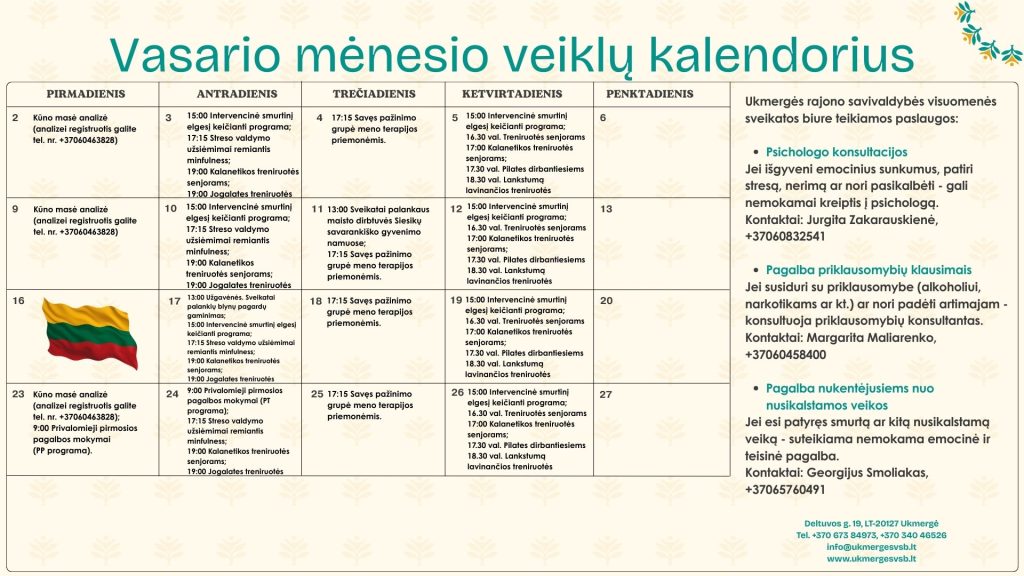 Ukmergės raj. savivaldybės Visuomenės sveikatos centras taip pat kviečia dalyvauti Ukmergės visuomenės sveikatos biuro organizuojamose veiklose visą vasario mėnesį.