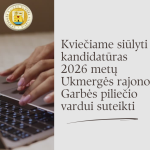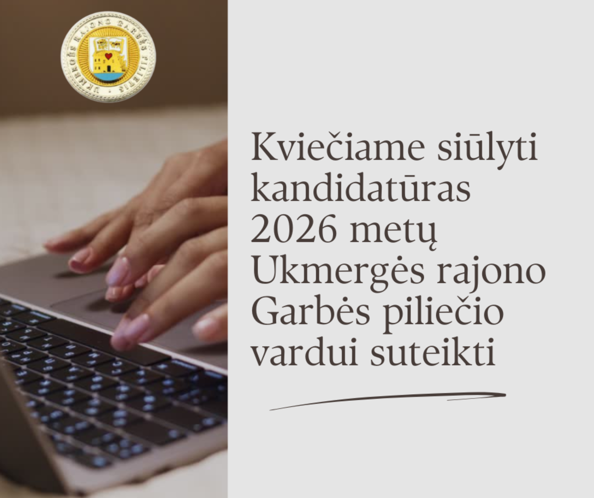 Kviečiame Savivaldybės tarybos narius, nevyriausybines organizacijas, vietos bendruomenes, kolegialias gyventojų grupes, kitus juridinius ir fizinius asmenis siūlyti kandidatūras 2026 metų Ukmergės rajono garbės piliečio vardui suteikti. Siūlymus teikti iki 2026 m. kovo 16 d. 1 kab., Kęstučio a. 3, Ukmergė, arba el. p.: savivaldybe@ukmerge.lt; priimamasis@ukmerge.lt. Tel. pasiteirauti 0 340 60309. Daugiau info čia.
