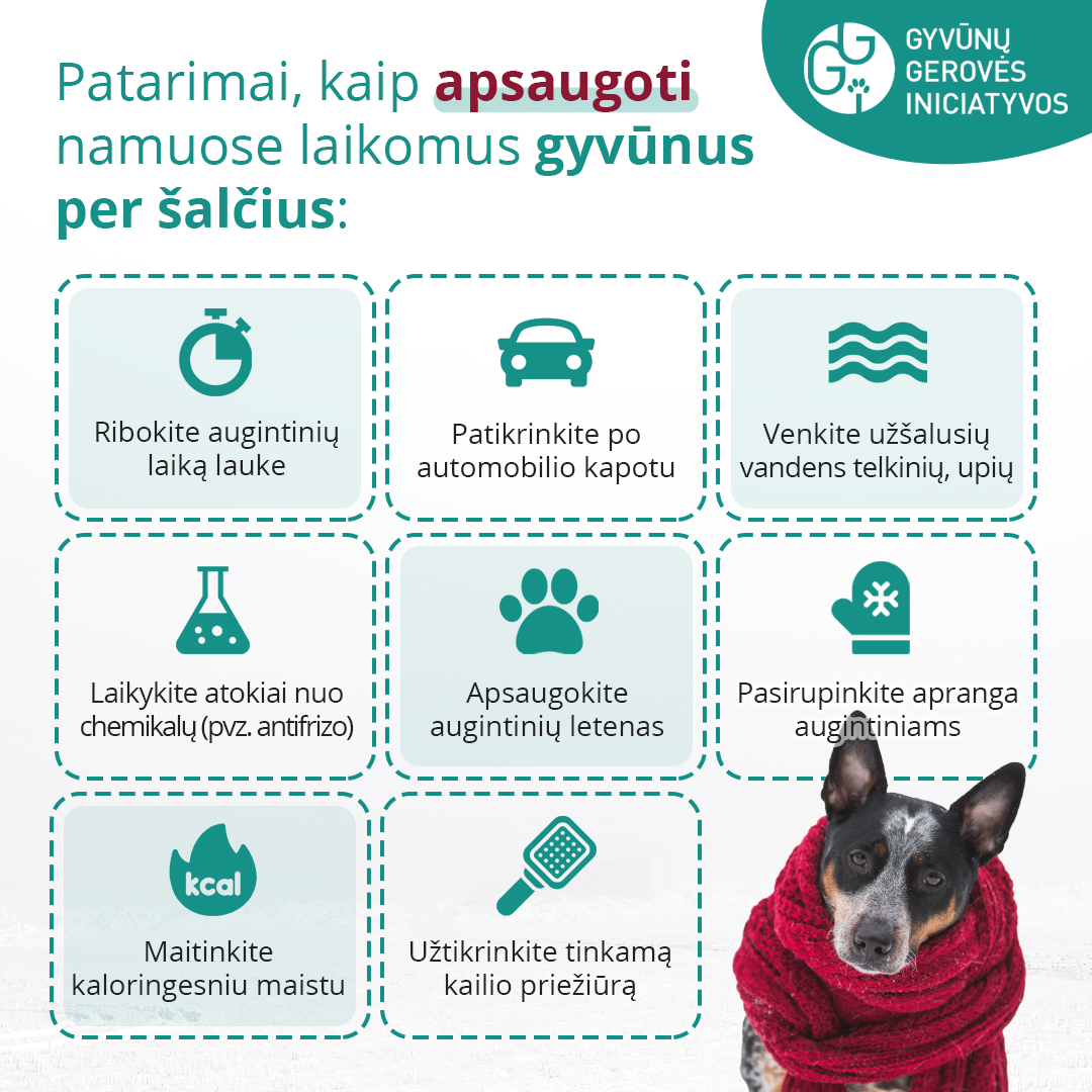 Nevyriausybinės organizacijos „Gyvūnų gerovės iniciatyvos“ specialistai primena, kad temperatūrai nukritus žemiau -15 reikia įleisti lauke gyvenančius šunis ir kates į vidaus patalpas, nes kitaip yra rizikuojama gyvūno sveikata ar net gyvybe.