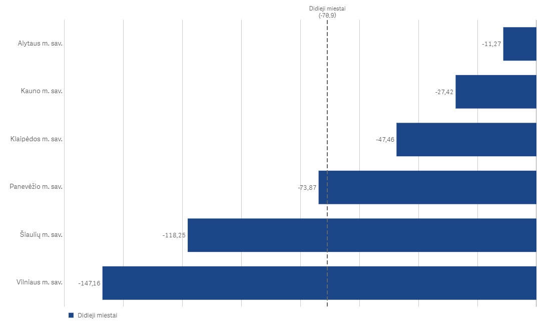 Pavyzdžiui, kaip pavaizduota 1-ame grafike, didžiųjų miestų klasterio NT mokesčio lengvatų vidurkio rodiklis yra -70,9 €/ha – jis parodo, kad šio klasterio savivaldybės 2021 m. vidutiniškai suteikė 70,9 euro lengvatų, tenkančių 1 užstatytos teritorijos hektarui. Visos savivaldybės, kurios suteikia didesnes lengvatas (į kairę nuo vidurkio), turės pajamų atotrūkius, kuriuos galima pamatyti 2-ame grafike.