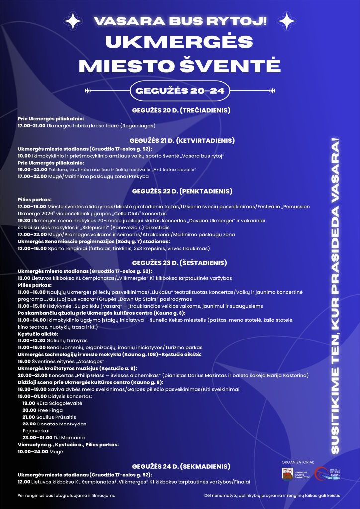Per renginius bus fotografuojama ir filmuojama. Dėl nenumatytų aplinkybių renginių programa ir programos laikas gali keistis.