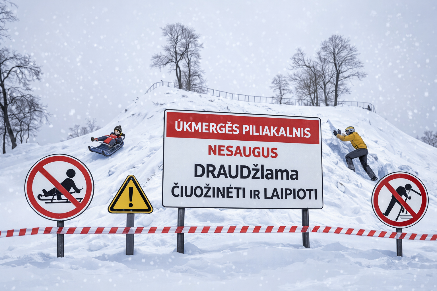 Prie piliakalnio netrukus atsiras „STOP“ juostos ir įspėjamosios lentelės, informuojančios apie galimą nuošliaužų pavojų ir taikomus draudimus.