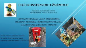 UKMERGĖS VL. ŠLAITO VIEŠOJI BIBLIOTEKA. Edukaciniai užsiėmimai vaikams „LEGO konstravimas ir programavimas“. Tai užsiėmimai, supažindinantys su inovatyviomis technologijomis, dalyviai konstruoja su „LEGO Education WeDo2.0“, „Mindstorms EV3“, „Fischertechnik“ konstruktoriais. Užsiėmimai skirti vaikams nuo 5 iki 10 metų. Užsiėmimų trukmė – 1 val. Nemokama. Reikalinga registracija: +370 659 34831