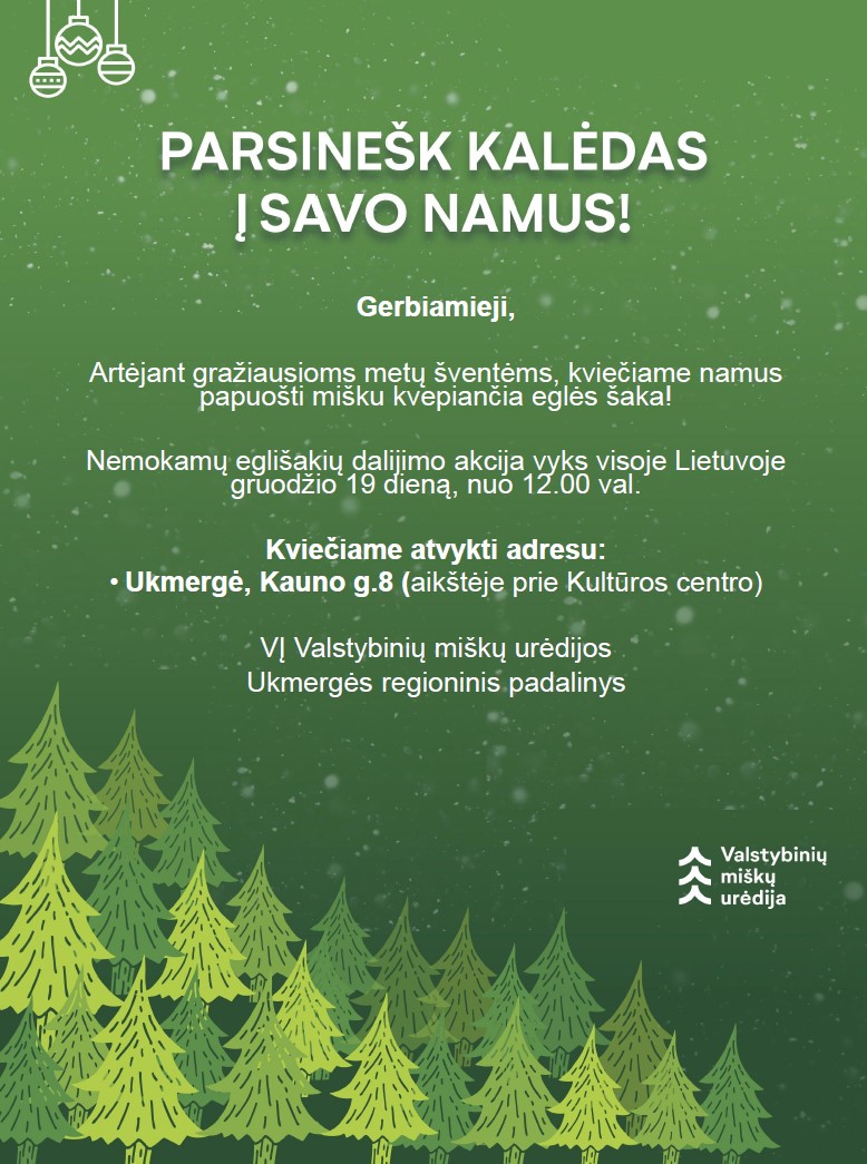Jau devynioliktus metus Valstybinių miškų urėdijos (VMU) miškininkai kviečia gyventojus į kasmetinę akciją „Parsinešk Kalėdas į savo namus“. Kalėdos – artumo, bendrumo ir rūpestingumo šventė, todėl miškininkai nemokamai dalins eglių ir pušų šakas.