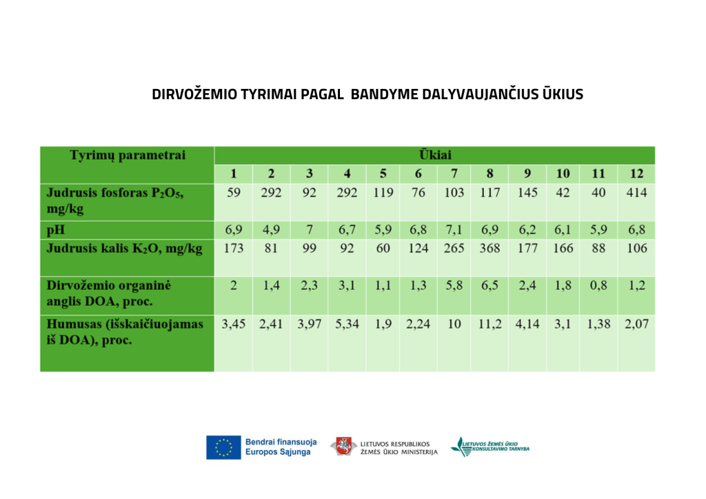 Kadangi bandymai vykdomi visoje Lietuvoje, dirvožemiai labai skirtingi: nuo labai rūgščių (pH 4,9) iki neutralių (pH 7,0–7,1), žr. lentelę. (prisegta)