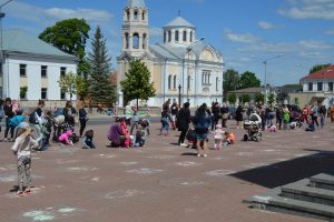 Birželio pirmąją aikštė prie Kultūros centro priklausė vaikams. Skambant linksmai muzikai ir dangumi ridinėjantis saulutei vaikai ant šaligatvio plytelių priešė saulutes, sveikino mamas ir tėčius, ir vieni kitus. Vaikams piešti padėjo Nykštukas Nukas, Šuniukas Rudis, Varna Kar ir Pelėda Plunksna.