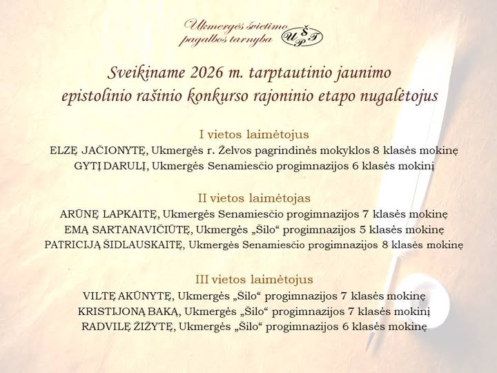 Pasibaigus 55-ojo tarptautinio jaunimo epistolinio rašinio konkurso rajoniniam etapui, buvo paskelbti geriausi darbai. Konkursui pateikta vienuolika mokinių rašinių iš keturių ugdymo įstaigų. Šių metų tema kvietė jaunimą apmąstyti, kodėl skaitmeniniame pasaulyje svarbus žmogiškasis ryšys. Geriausi darbai išsiųsti į šalies etapą.