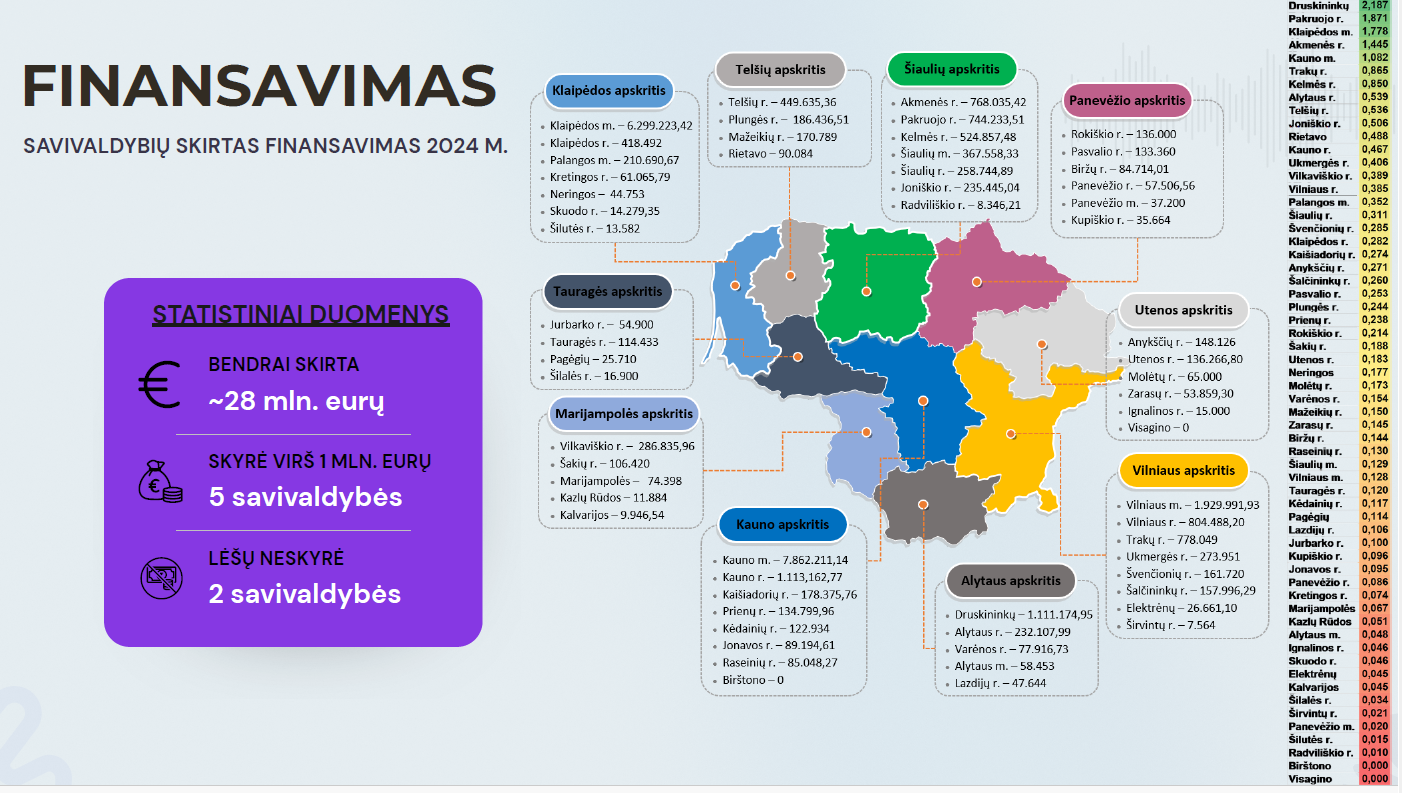2024 m. Lietuvos savivaldybės kultūros paveldo apsaugai skyrė beveik 28 mln. eurų – tai vienas didžiausių finansavimo rodiklių per visą stebėsenos laikotarpį. Vis dėlto ekspertai pažymi, kad ši suma vis dar sudaro tik apie 20–30 proc. realių paveldo tvarkybos poreikių, todėl būtina stiprinti finansinius instrumentus ir plėsti paskatas paveldo objektų savininkams.