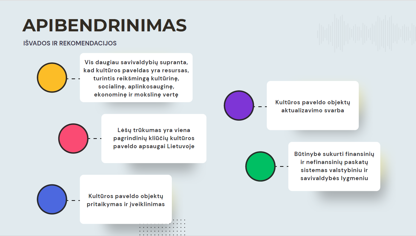 Ekspertai pabrėžia, kad siekiant dar geresnių rezultatų būtina plėsti finansinių ir nefinansinių paskatų sistemą – nuo dalinio tvarkybos darbų finansavimo ir lengvatinių paskolų iki nekilnojamojo turto mokesčio lengvatų bei metodinės pagalbos paveldo savininkams. Tokios priemonės padėtų efektyviau išnaudoti Lietuvoje registruotų daugiau nei 26 tūkst. nekilnojamojo kultūros paveldo objektų potencialą. Su naujausiu tyrimu galima susipažinti čia.