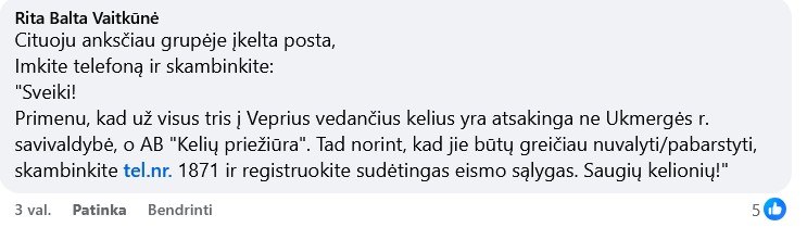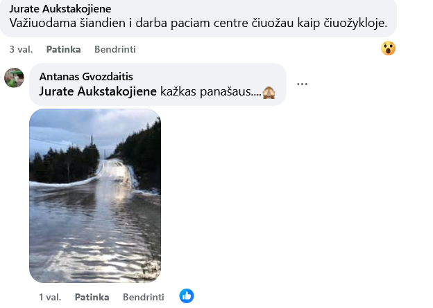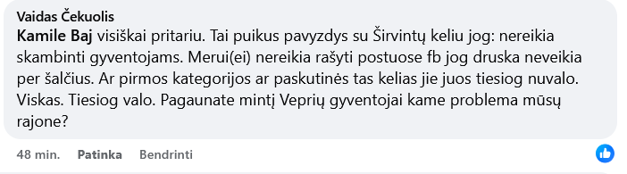 Veprių gyventojai skundėsi keliu, virtusiu čiuožykla. „Veprių pagrindinis kelias yra visiška čiuožykla, jei mašina staiga išslystų iš šalutinio kelio, galėtum paleisti vairą ir pradėti pildyti įvykio deklaraciją, kol slystum. Realiai ant Veprių ežero dabar turbūt saugiau važinėt, nei ant kelio”, – piktinosi vepriškis.