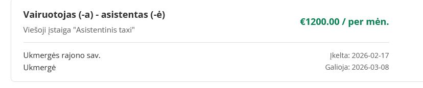 VšĮ „Asistentinis taxi“ laimėjo savivaldybės konkursą pavėžėjimo su asistavimu paslaugoms ir pakeis VšĮ „Socialinis taksi“. Paslaugos finansuojamos savivaldybės biudžeto lėšomis, todėl savivaldybės gyventojams jos teikiamos ženkliai mažesnėmis nei įprastai rinkoje kainomis.Paslaugą galima užsakyti tel. +370 617 60760 arba el. p. ukmerge@asistentinistaxi.lt. Šiuo metu VšĮ „Asistentinis taxi” ieško darbuotojų: vairuotojo-asistento.