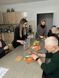 Visuomenės sveikatos specialistės Aistė Šiaučiūnė ir Karolina Vaitkūnė vedė edukaciją apie sveikatai palankią mitybą Siesikų savarankiško gyvenimo namuose. Dalyviai diskutavo apie vaisių ir daržovių naudą, gamino glotnučius ir dalijosi įspūdžiais.