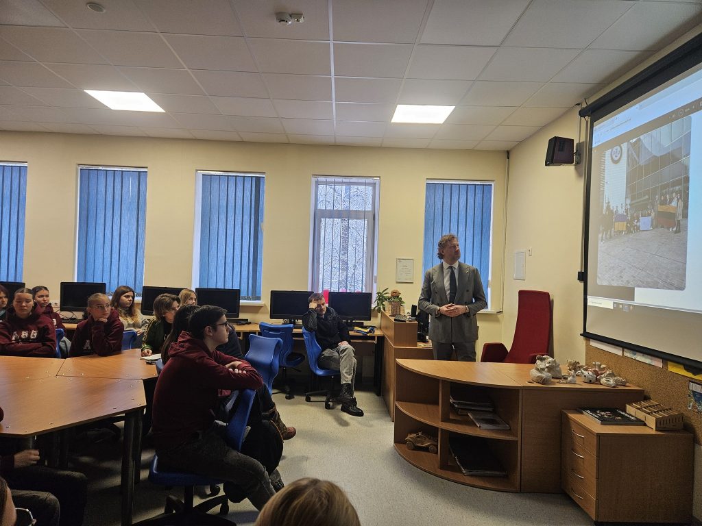 Antano Smetonos gimnazijoje viešėjęs UAB „Projektavimo sprendimai“ ir asociacijos „Šešios AM“ įkūrėjas, verslininkas, mecenatas Karolis Sankauskas gimnazistams pasakojo apie daugiau nei 170 humanitarinių misijų Ukrainoje.